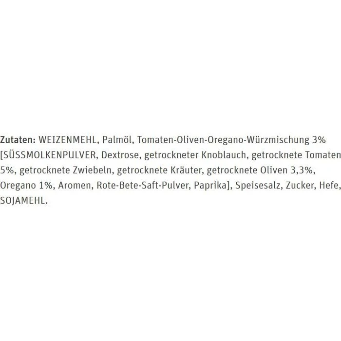 Zutaten: WEIZENMEHL, Palmöl, Tomaten-Oliven-Oregano-Würzmischung 3% [SÜSSMOLKENPULVER, Dextrose, getrockneter Knoblauch, getrocknete Tomaten 5%, getrocknete Zwiebeln, getrocknete Kräuter, getrocknete Oliven 3,3%, Oregano 1%, Aromen, Rote-Bete-Saft-Pulver, Paprika], Speisesalz, Zucker, Hefe, SOJAMEHL.