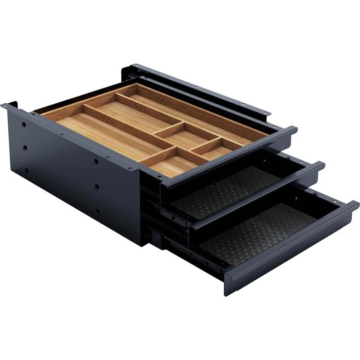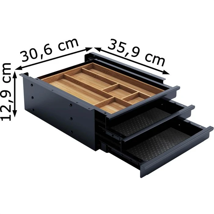 • 6 unterschiedlich große Utensilienfächer im ersten Schubfach aus Bambus
