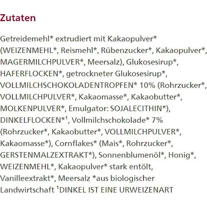 Zutaten: Getreidemehl* extrudiert mit Kakaopulver* (WEIZENMEHL*, Reismehl*, Rübenzucker*, Kakaopulver*, MAGERMILCHPULVER*, Meersalz), Glukosesirup*, HAFERFLOCKEN*, getrockneter Glukosesirup*, VOLLMILCHSCHOKOLADENTROPFEN* 10% (Rohrzucker*, VOLLMILCHPULVER*, Kakaomasse*, Kakaobutter*, MOLKENPULVER*, Emulgator: SOJALECITHIN*), DINKELFLOCKEN*, Vollmilchschokolade* 7% (Rohrzucker*, Kakaobutter*, VOLLMILCHPULVER*, Kakaomasse*), Cornflakes* (Mais*, Rohrzucker*, GERSTENMALZEXTRAKT*), Sonnenblumenöl*, Honig*, WEIZENMEHL*, Kakaopulver* stark entölt, Vanilleextrakt*, Meersalz