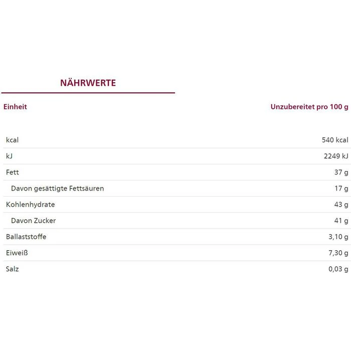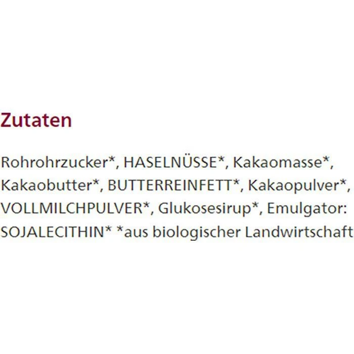 Zutaten: Rohrohrzucker*, HASELNÜSSE*, Kakaomasse*, Kakaobutter*, BUTTERREINFETT*, Kakaopulver*, VOLLMILCHPULVER*, Glukosesirup*, Emulgator: SOJALECITHIN*