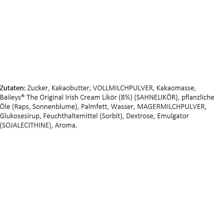 Zutaten: Zucker, Kakaobutter, VOLLMILCHPULVER, Kakaomasse, Baileys® The Original Irish Cream Likör (8%) (SAHNELIKÖR), pflanzliche Öle (Raps, Sonnenblume), Palmfett, Wasser, MAGERMILCHPULVER, Glukosesirup, Feuchthaltemittel (Sorbit), Dextrose, Emulgator (SOJALECITHINE), Aroma.