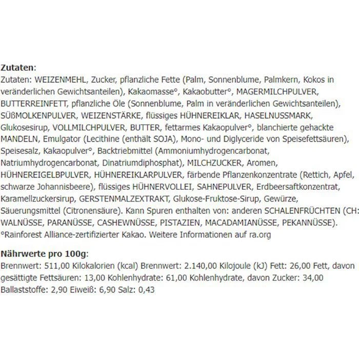 Zutaten: WEIZENMEHL, Zucker, pflanzliche Fette (Palm, Sonnenblume, Palmkern, Kokos in veränderlichen Gewichtsanteilen), Kakaomasse, Kakaobutter, MAGERMILCHPULVER, BUTTERREINFETT, pflanzliche Öle (Sonnenblume, Palm in veränderlichen Gewichtsanteilen), SÜSSMOLKENPULVER, WEIZENSTÄRKE, flüssiges HÜHNEREIKLAR, HASELNUSSMARK, Glukosesirup, VOLLMILCHPULVER, BUTTER, fettarmes Kakaopulver, blanchierte gehackte MANDELN, Emulgator (Lecithine (enthält SOJA), Mono- und Diglyceride von Speisefettsäuren), Speisesalz, Kakaopulver, Backtriebmittel (Ammoniumhydrogencarbonat, Natriumhydrogencarbonat, Dinatriumdiphosphat), MILCHZUCKER, Aromen, HÜHNEREIGELBPULVER, HÜHNEREIKLARPULVER, färbende Pflanzenkonzentrate (Rettich, Apfel, schwarze Johannisbeere), flüssiges HÜHNERVOLLEI, SAHNEPULVER, Erdbeersaftkonzentrat, Karamellzuckersirup, GERSTENMALZEXTRAKT, Glukose-Fruktose-Sirup, Gewürze, Säuerungsmittel (Citronensäure).