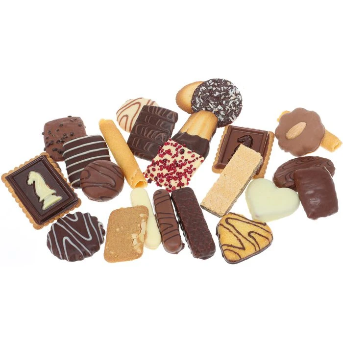 WEIZENMEHL, Zucker, pflanzliche Fette (Palm, Kokos), Kakaomasse, Kakaobutter, Farinzucker, BUTTERREINFETT, SÜßMOLKENPULVER, MAGERMILCHPULVER, VOLLMILCHPULVER, Invertzuckersirup, fettarmes Kakaopulver, WEIZENSTÄRKE, HAFERFLOCKEN, Dextrose, Emulgatoren: Lecithine (enthält SOJA), Mono- und Diglyceride von Speisefettsäuren; MILCHZUCKER, flüssiges HÜHNENEIWEIß, MANDELN, Honig, natürliches Aroma, WEIZENKORNMEHL, Backtriebmittel: Natriumcarbonate, Ammoniumcarbonate, Diphosphate; pflanzliche Öle (Sonnenblume, Raps), Kokosraspeln, Salz, Glukosesirup, VOLLEIPULVER, modifizierte Stärke, HASELNÜSSE, kandierte Orangenschalen (Orangenschalen, Glukose-Fruktose-Sirup, Zucker), Puffreis, HÜHNERTROCKENEIEIWEIß, MILCHEIWEIß, flüssiges HÜHNEREIEIGELB, Karamellzuckersirup, Glukose-Fruktose-Sirup, Kaffeepulver, Gewürze, GERSTENMALZEXTRAKT, Vanilleextrakt, Farbstoff: Beta-Carotin.