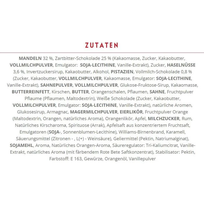 Zutaten: MANDELN 32 %, Zartbitter-Schokolade 25 %(Kakaomasse, Zucker, Kakaobutter, VOLLMILCHPULVER, Emulgator: SOJALECITHINE, Vanille-Extrakt), Zucker, HASELNÜSSE 3,6 %, Invertzuckersirup, Kakaobutter, Alkohol, PISTAZIEN, Vollmilch-Schokolade 0,8 %(Zucker, Kakaobutter, VOLLMILCHPULVER, Kakaomasse, Emulgator: SOJALECITHINE, Vanille-Extrakt), SAHNEPULVER, VOLLMILCHPULVER, Glukose-Fruktose-Sirup, Kakaomasse, BUTTERREINFETT, Kirschen, BUTTER, Orangenschalen, Pflaumen, SAHNE, Fruchtpulver Pflaume(Pflaumen, Maltodextrin), Weiße Schokolade(Zucker, Kakaobutter, VOLLMILCHPULVER, Emulgator: SOJALECITHINE, Vanille-Extrakt), natürliche Aromen, Glukosesirup, Armagnac, MAGERMILCHPULVER, EIERLIKÖR, Fruchtpulver Orange (Maltodextrin, Orangen, natürliches Aroma), Orangenlikör, Apfel, MILCHZUCKER, Rum, Natürliches Kirscharoma, Spirituose (Arrak), Apfelsaft aus konzentriertem Fruchtsaft, Emulgatoren ( SOJA-, Sonnenblumen-Lecithine), Williams-Birnenbrand, Karamell, Säuerungsmittel (Zitronen – , L(+) -Weinsäure), Geliermittel (Pektin, Natriumalginat), SOJAMEHL, Aroma, Natürliches Orangen-Aroma, Säureregulator: Tri-Kaliumcitrat, Vanille-Extrakt, natürliches Aroma (mit färbendem Rote Bete Saftkonzentrat), Stabilisator: Pektin, Farbstoff: E 163, Gewürze, Orangenöl, Vanillepulver